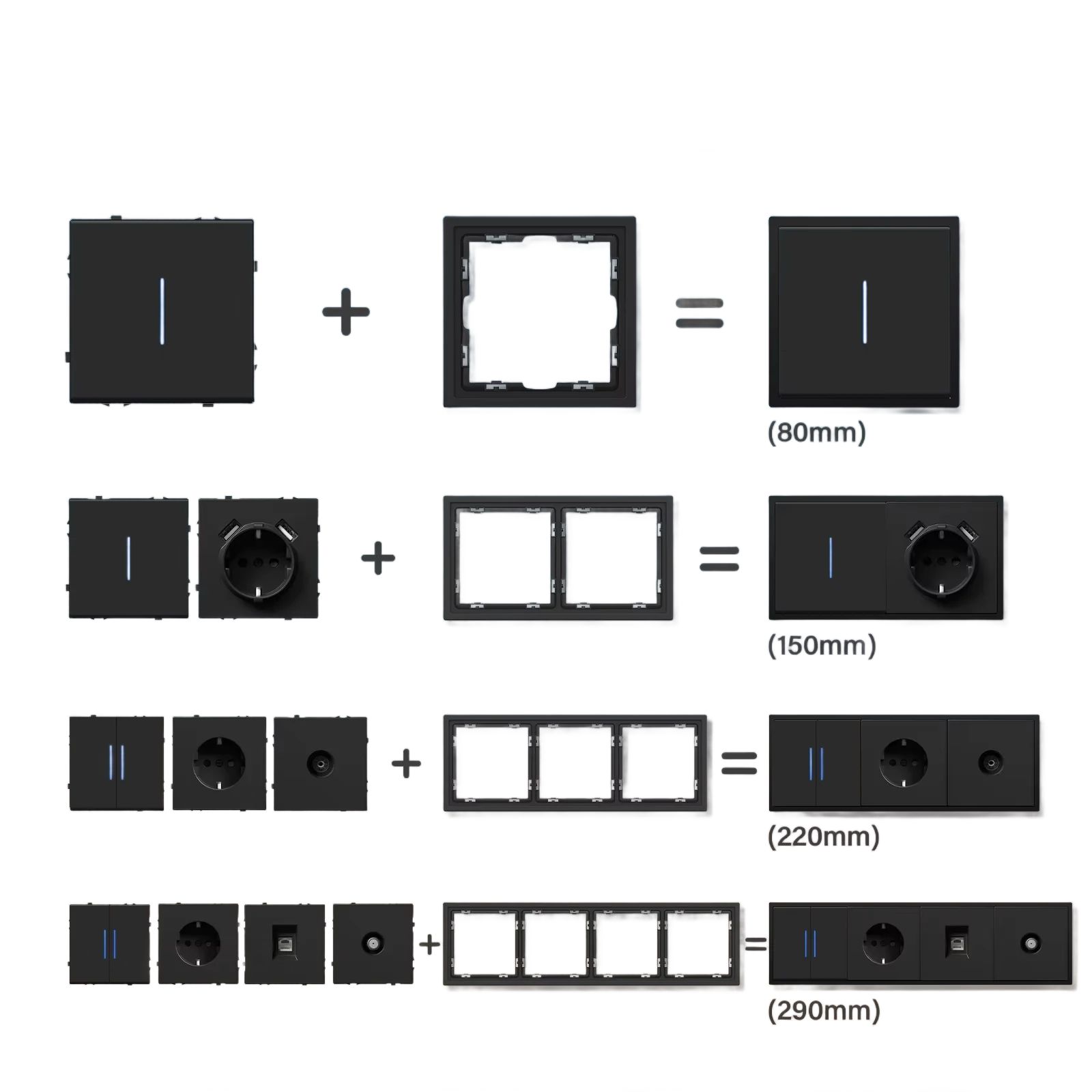 - Установка выключателя осуществляется по стандартной схеме, в круглую монтажную коробку для скрытого монтажа диаметром 65-70 мм и глубиной 50 мм с межцентровым расстоянием для крепежных винтов 60 мм. Крепление выключателя к монтажной коробке производится шурупами из комплекта. Модульная конструкция позволяет использовать механизм выключателя в разных комбинациях с розетками и другими устройствами.