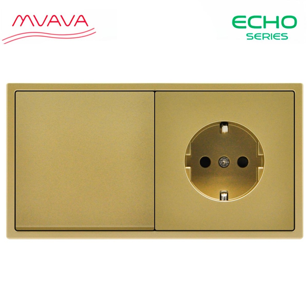 Выключатель echo с розеткой, 1 клавиша 1 розетка, 2 поста (М1+1F) рамка пластик 152х81мм цвет золотой