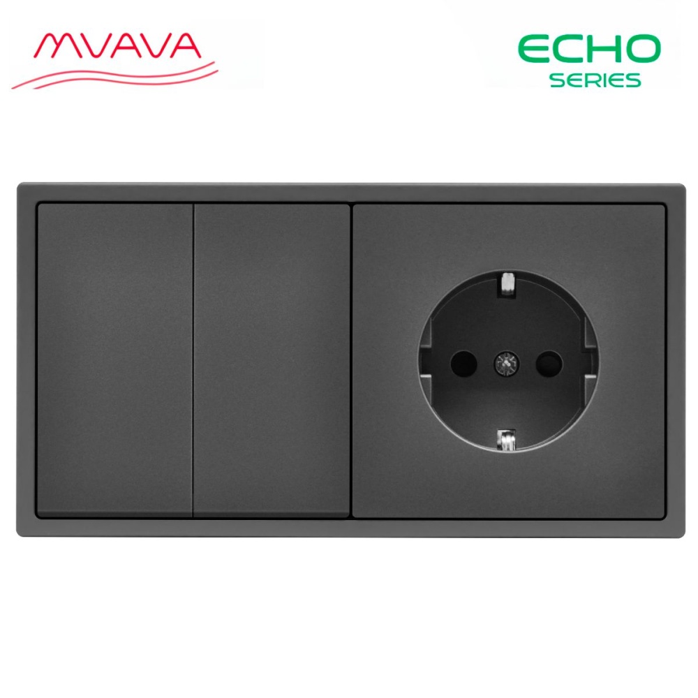 Выключатель echo с розеткой, 2 клавиши 1 розетка, 2 поста (М2+1F) рамка пластик 152х81мм цвет серый