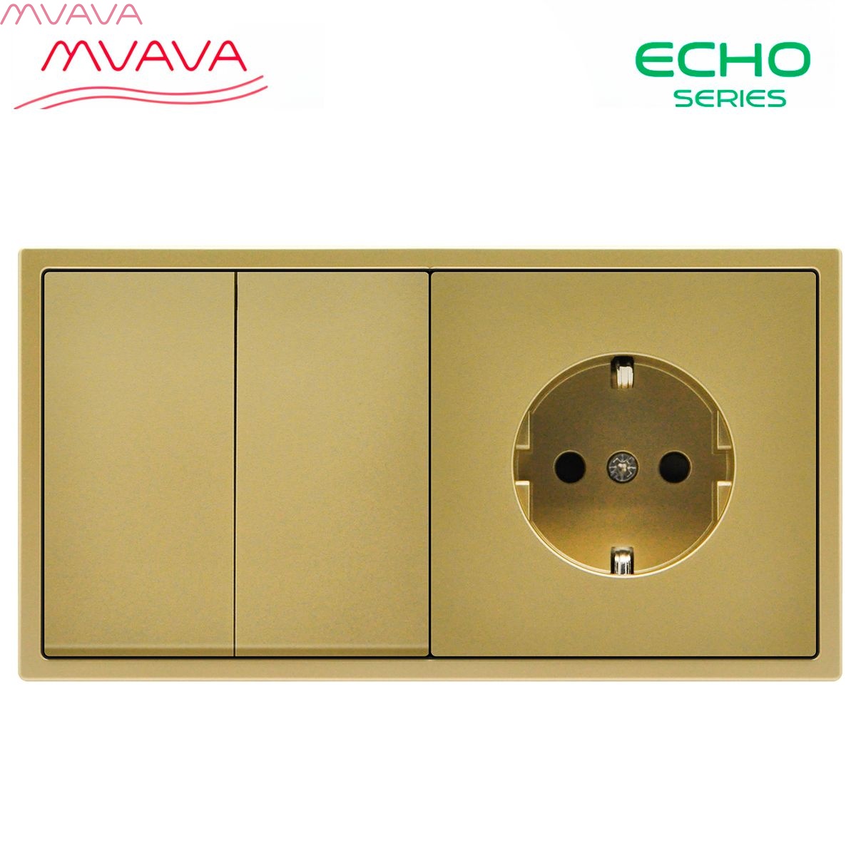 Выключатель echo с розеткой, 2 клавиши 1 розетка, 2 поста (М2+1F) рамка пластик 152х81мм цвет золото