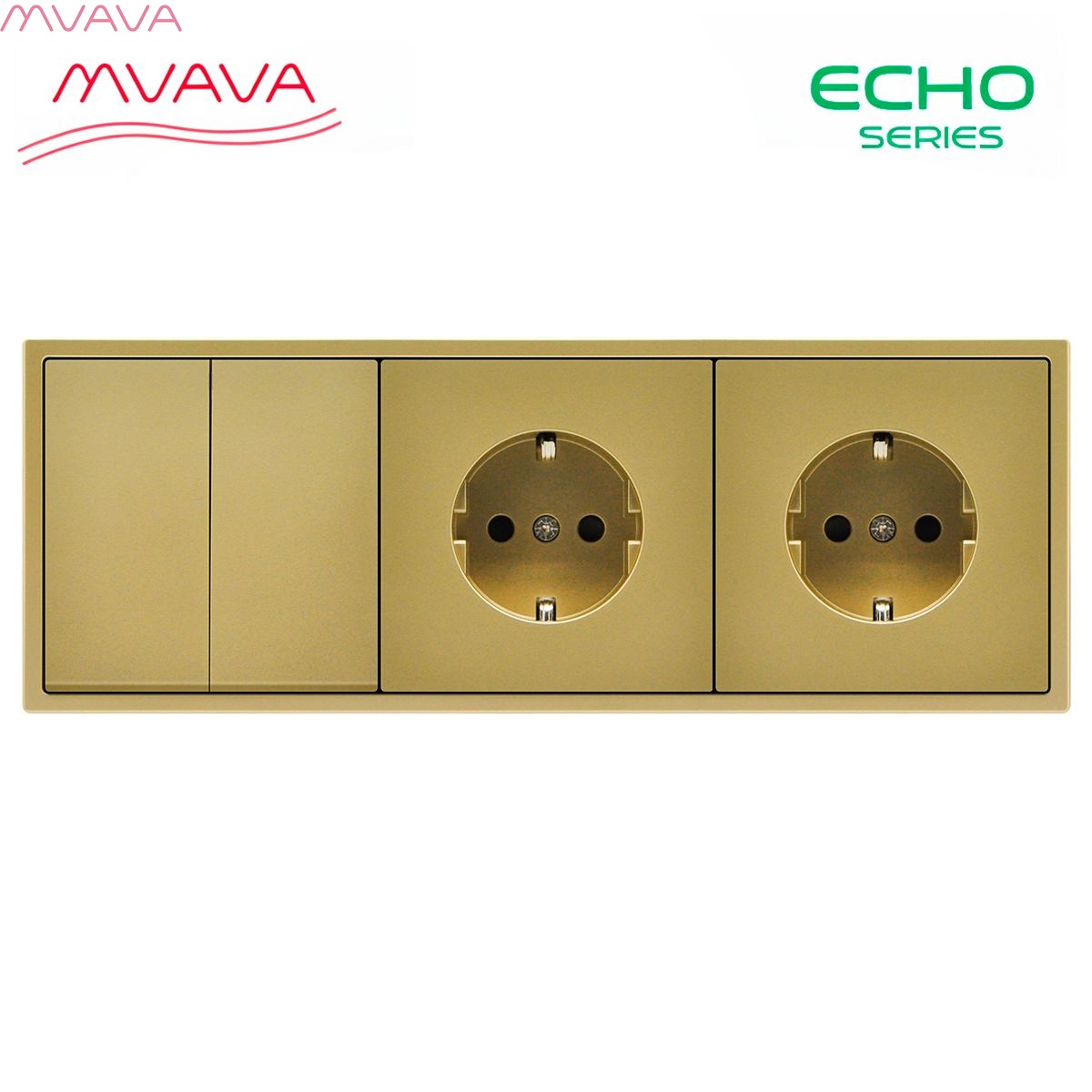Выключатель echo с розеткой, 2 клавиши 2 розетки, 3 поста (M2+2F) рамка пластик 223х81мм цвет золото