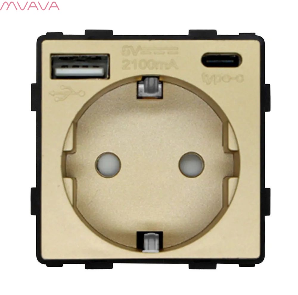 - 86-1F&AC2.4-GD, Механизм розетки с двумя USB и type-С портами 5 вольт и выходным током 2.1А, для питания и зарядки электронных устройств.