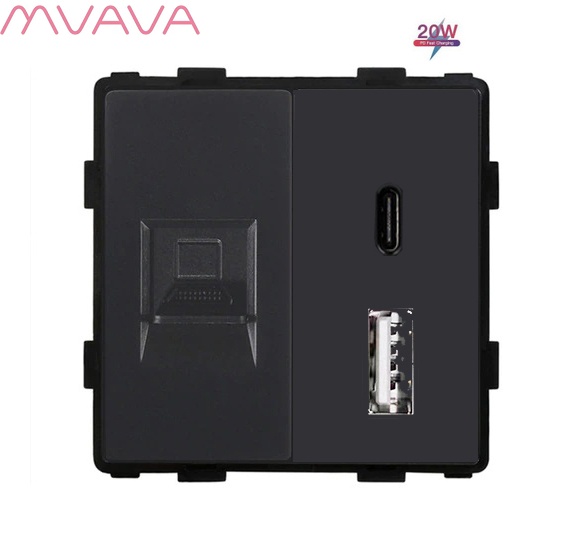 Механизм розетки Usb-typeC-/Cat5, 20w, цвет черный