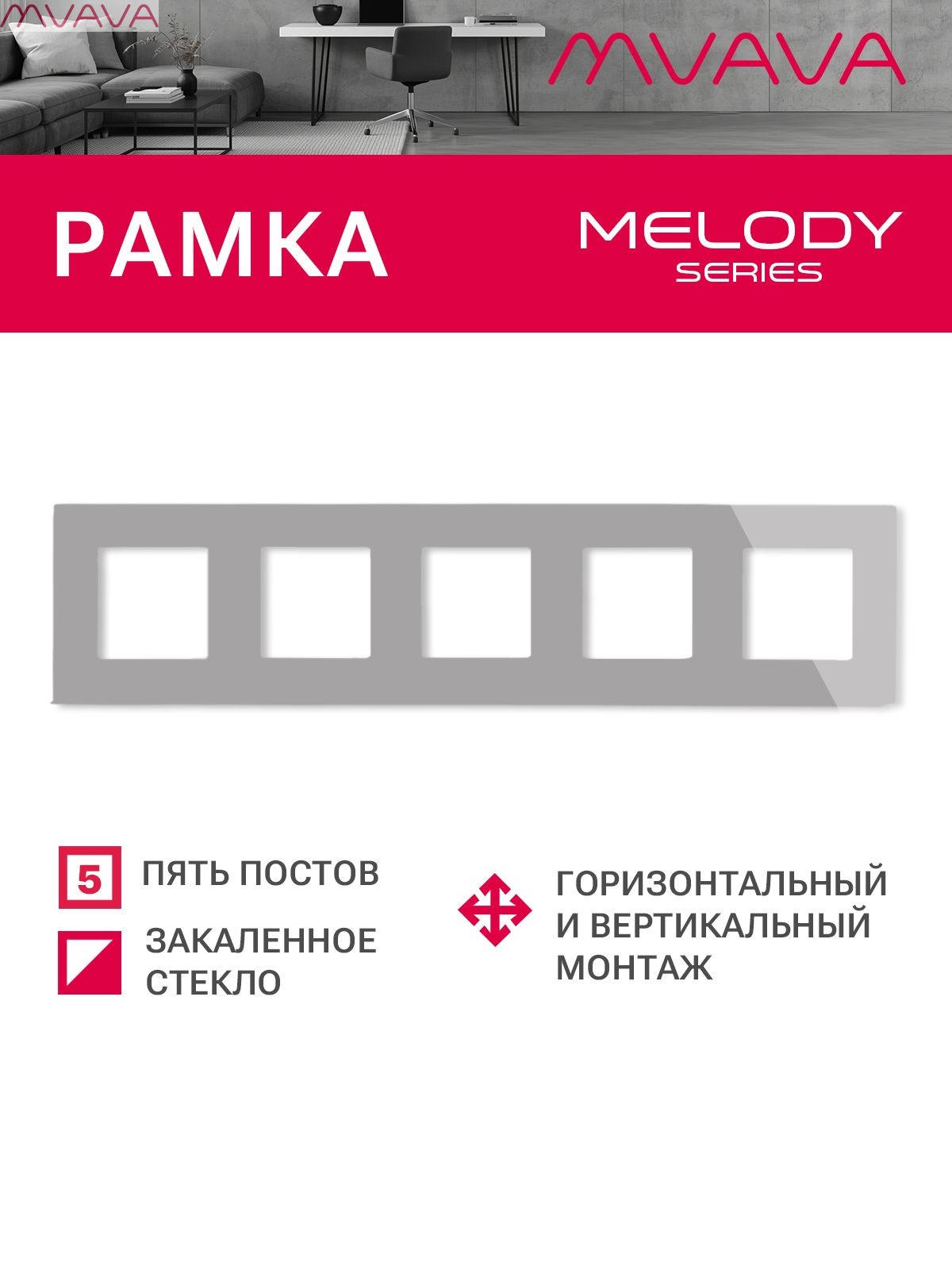 Рамка 5 постов 370*86мм, стекло, цвет серый