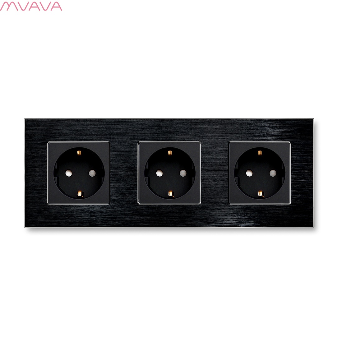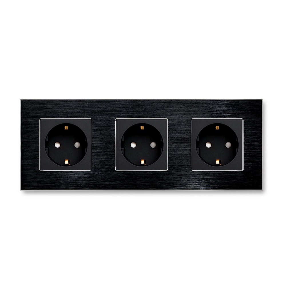 - Розетка тройная евростандарта в сборе с рамкой Aluminum, предназначена для сетей 250 В, ток 16 А.