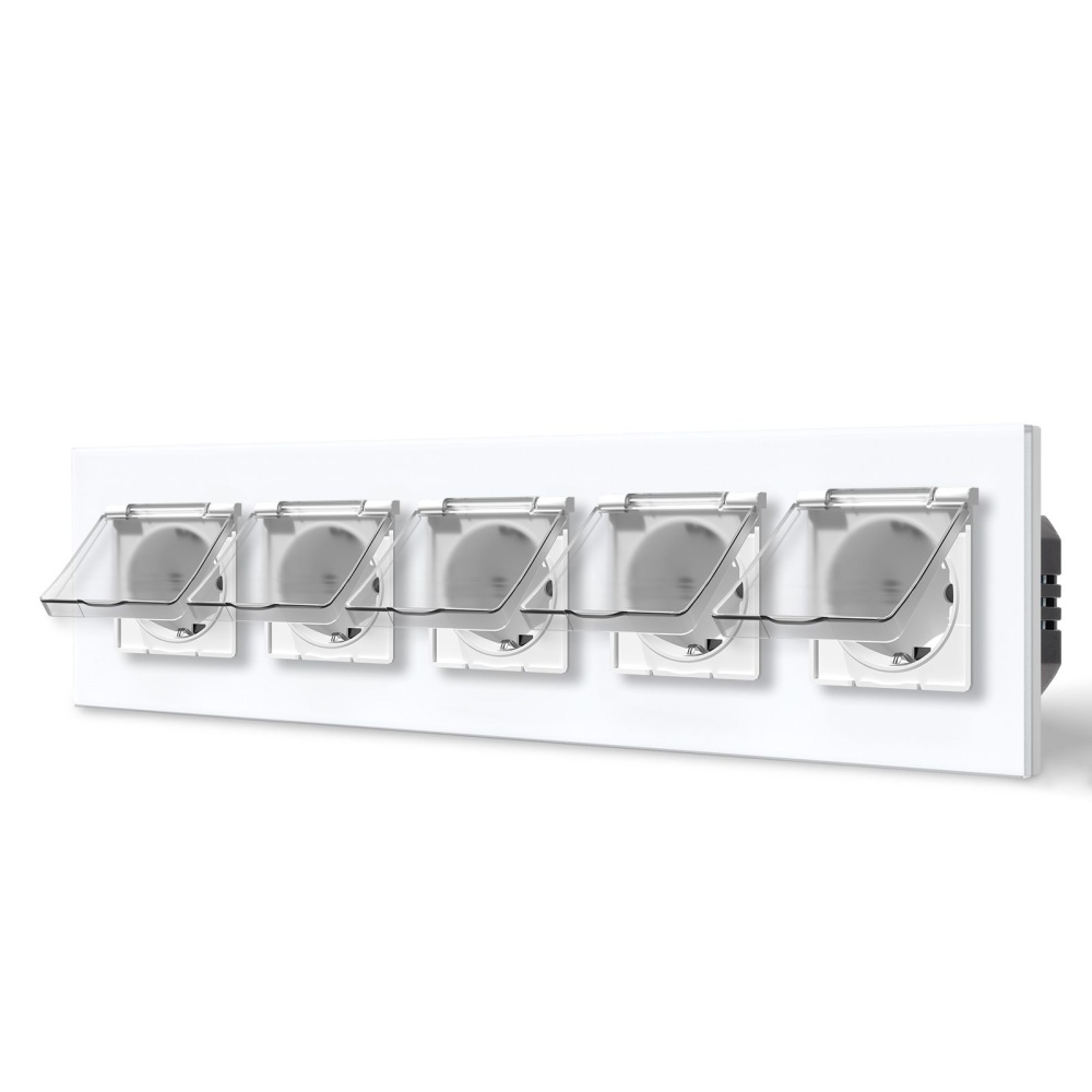 Розетка влагозащищенная с крышкой, 5 постов, рамка 370х86 стекло, цвет белый