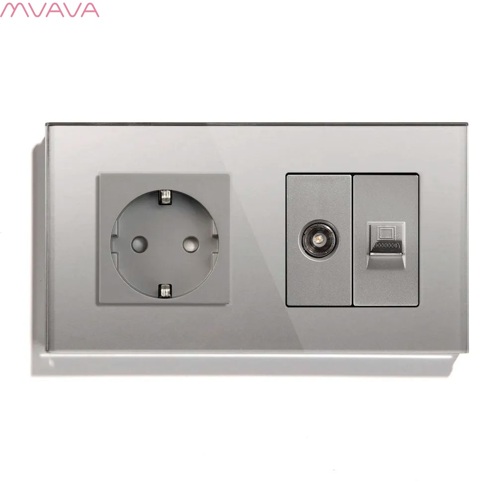 Розетка 2 поста с интернет/тв, cat5/tv, рамка 157х86мм стекло, цвет серый