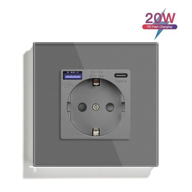 Розетка электрическая 1 пост с Usb/Type-C АC, быстрая зарядка 20W, цвет серый