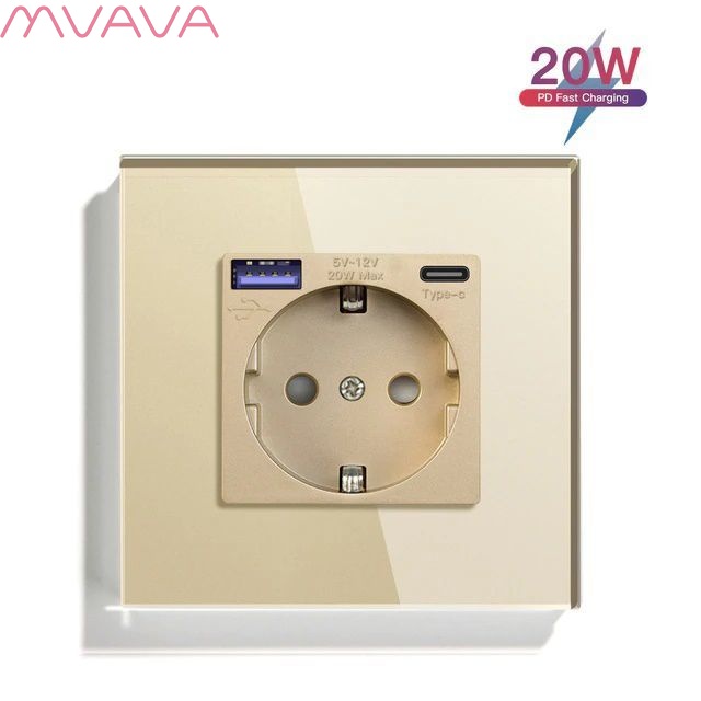 Розетка электрическая 1 пост с Usb/Type-C АC, быстрая зарядка 20W, цвет золотой