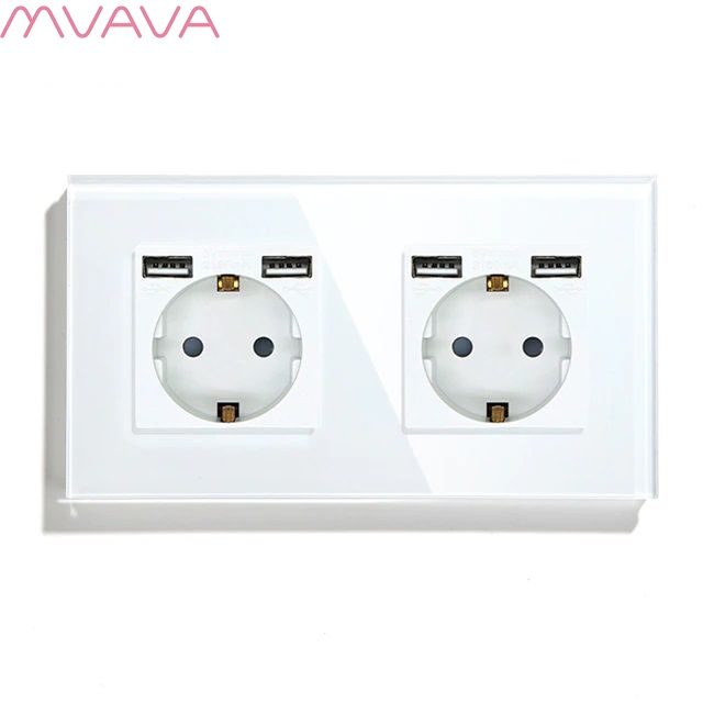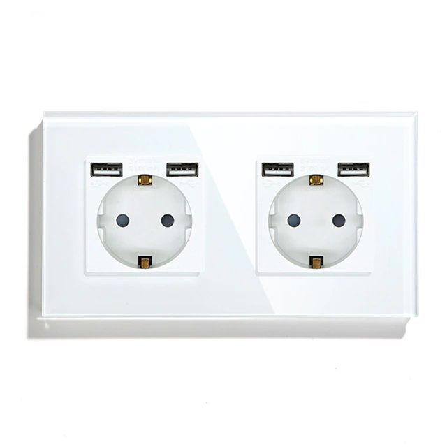 - Розетка двойная в сборе с стеклянной рамкой, это новая версия электрической розетки с USB без светодиода, не шумит(не пищит),подходит в стандартный круглый подрозетник размером 65-70мм, два USB 5 вольт и выходным током 2.1А, для питания и зарядки электронных устройств.