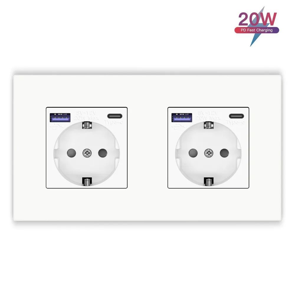 Розетка электрическая 2 поста с Usb/Type-C АC, быстрая зарядка 20W, рамка пластик, цвет белый