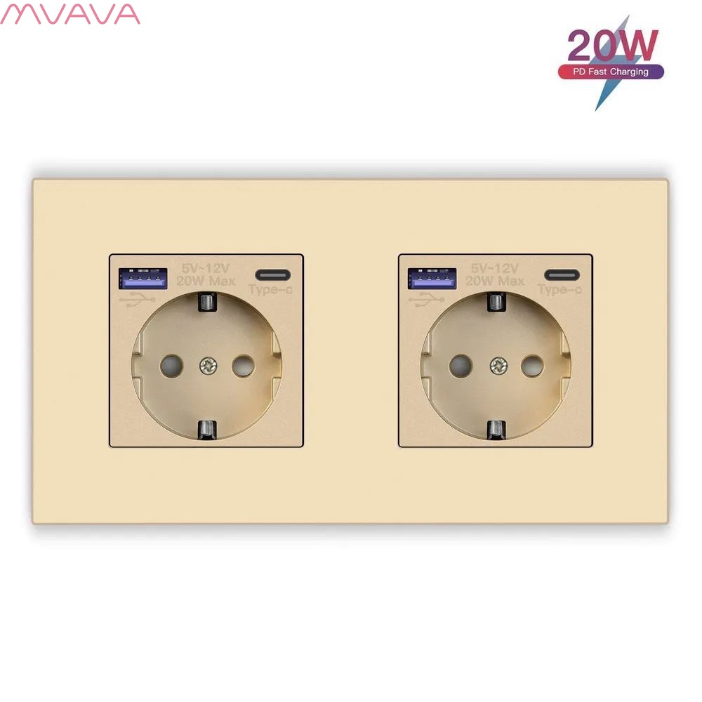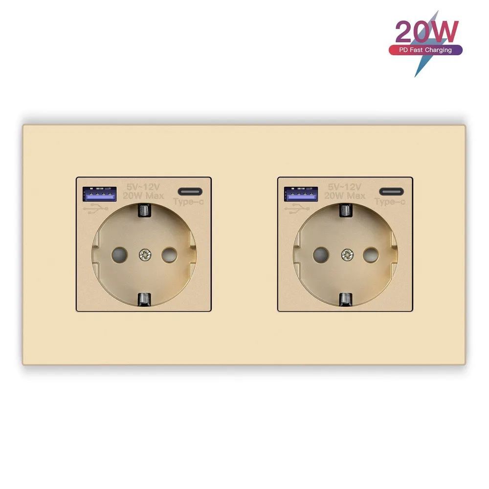 Розетка электрическая 2 поста с Usb/Type-C АC, быстрая зарядка 20W, рамка пластик, цвет золото