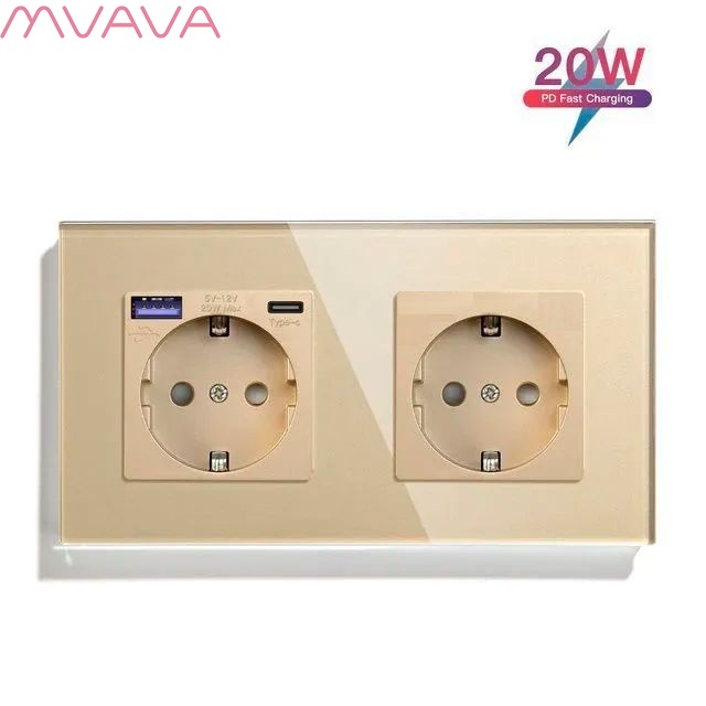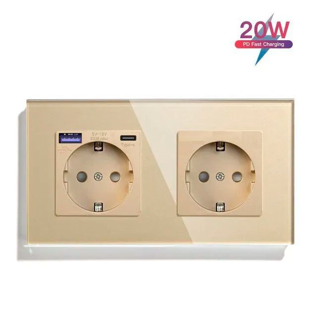 Розетка электрическая 2 поста с Usb/Type-C и розеткой, быстрая зарядка 20W, цвет золото