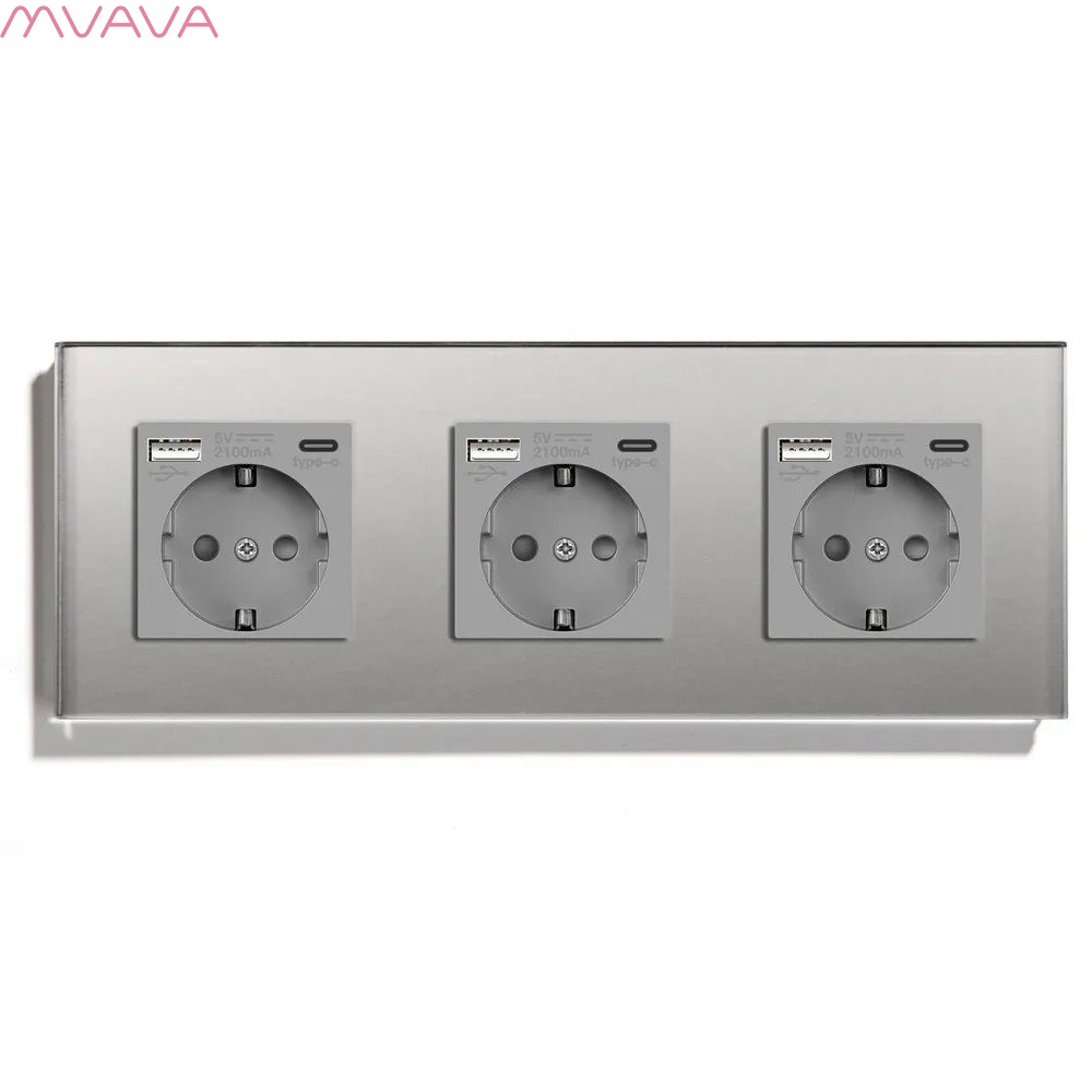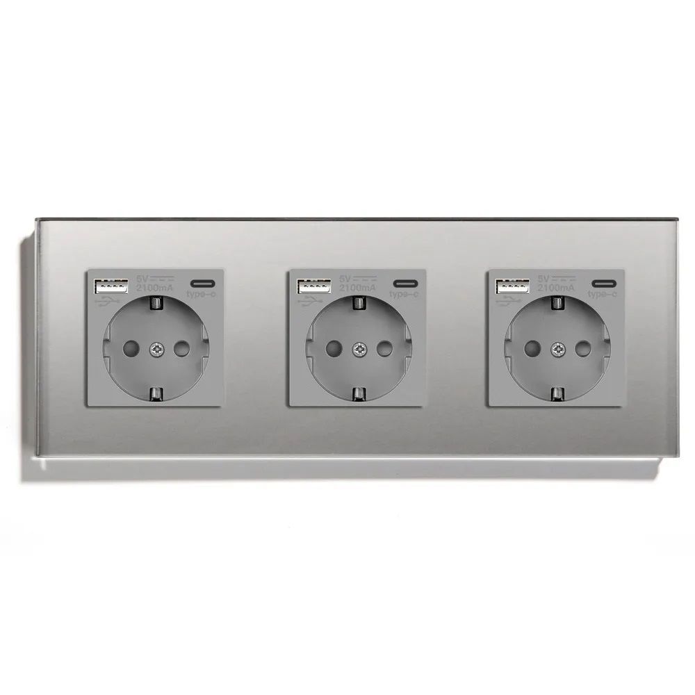 Розетка электрическая 3 поста, с Usb/Type-C АC, рамка 228х86мм стекло, цвет серый