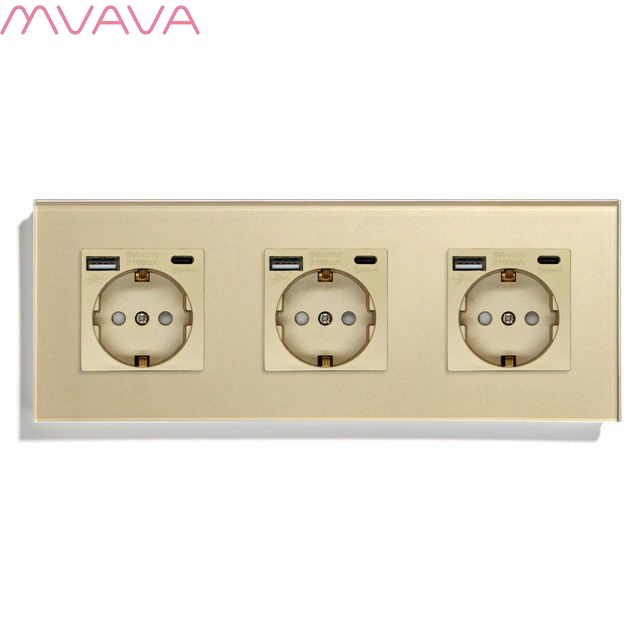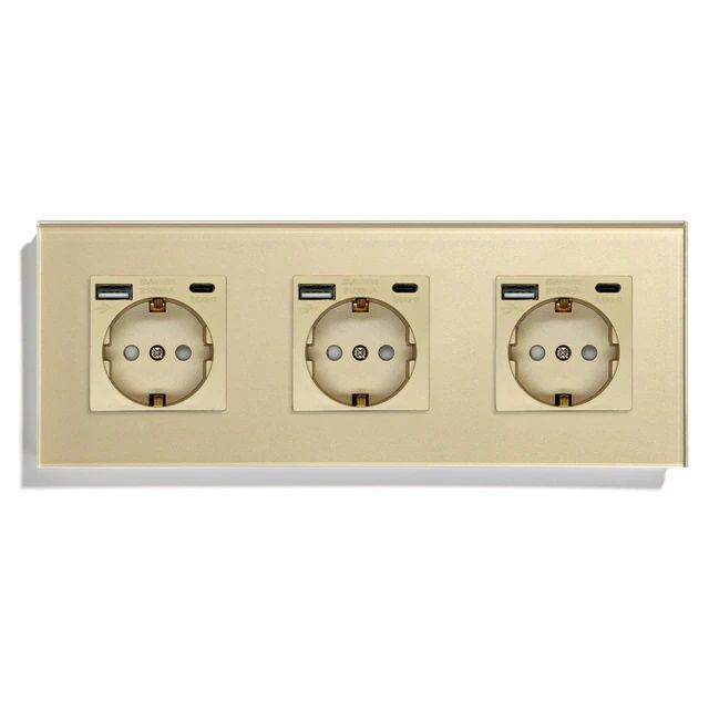 Розетка электрическая 3 поста, с Usb/Type-C АC, рамка 228х86мм стекло, цвет золотой