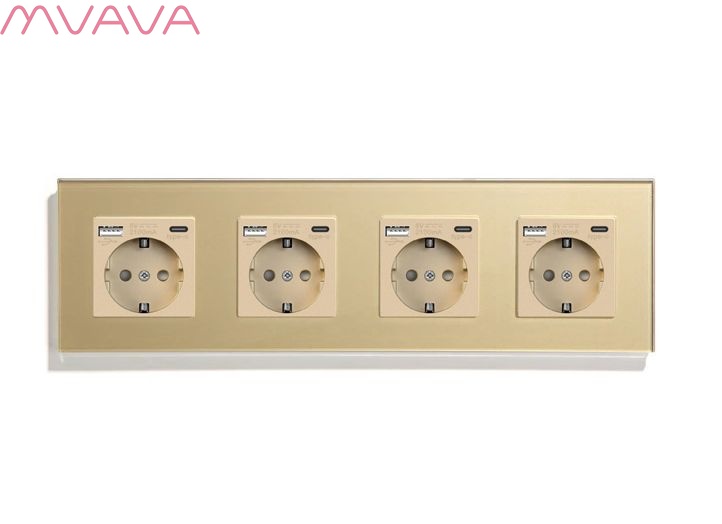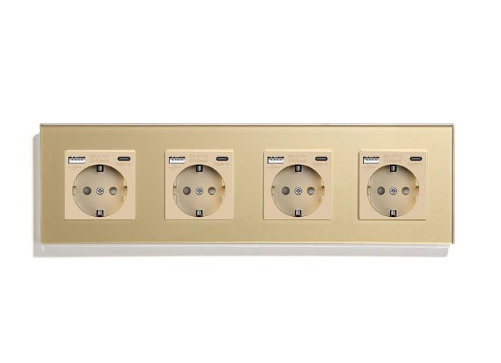 Розетка электрическая 4 поста, с Usb/Type-C АC, рамка 299х86мм стекло, цвет золотой