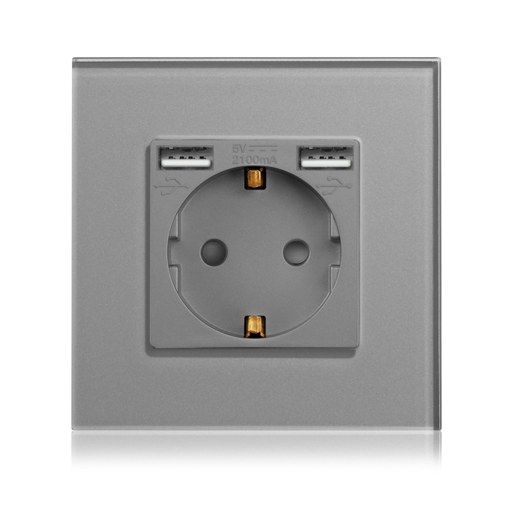 Розетка электрическая с Usb AA, 1 пост 16А, рамка 86х86 стекло, цвет серый