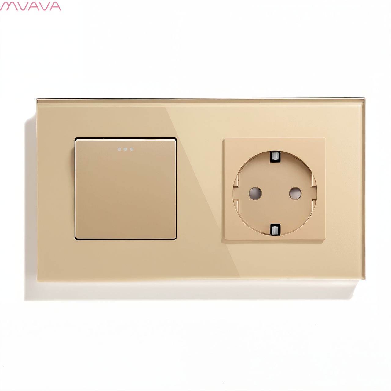 Выключатель с розеткой, 1 клавиша 1 розетка, 2 поста (М1+1F) рамка стекло 157х86мм цвет золотой