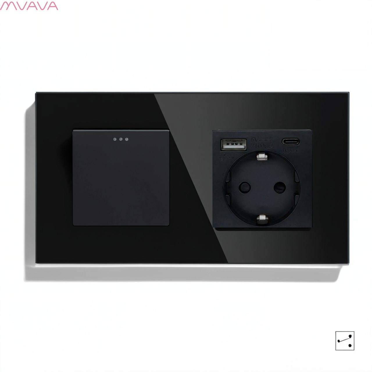 Выключатель с розеткой, 1 клавиша 1 розетка с usb type-c, 2 поста (М1+1FAC) рамка стекло 157х86мм цвет черный