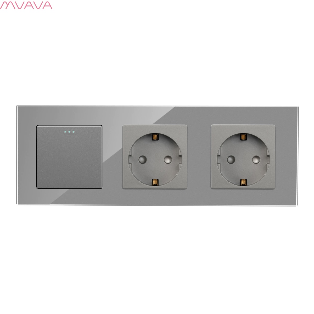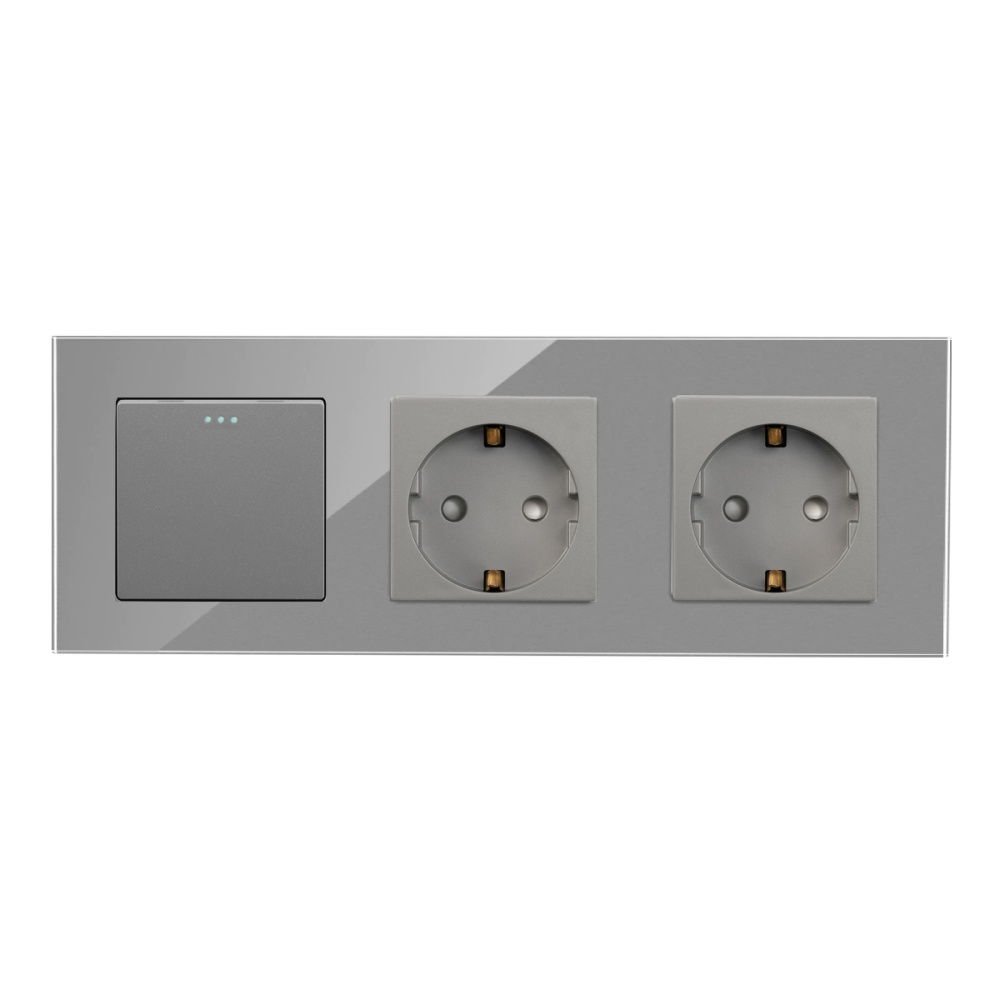Выключатель с розеткой, 1 клавиша 2 розетки, 3 поста (M1+2F) рамка стекло 228х86мм цвет серый