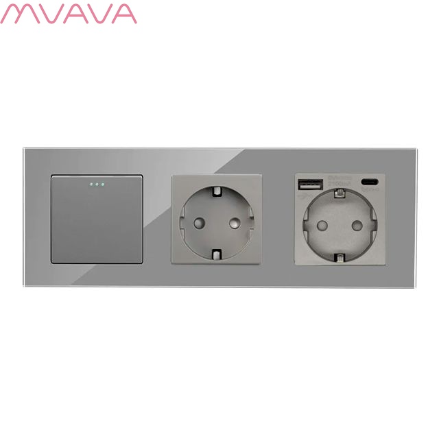Выключатель с розеткой, 1 клавиша 2 розетки c usb type-c, 3 поста (M1+2FAC) рамка стекло 228х86мм цветсерый
