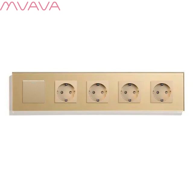 Выключатель с розеткой, 1 клавиша 4 розетки, 5 постов (M1+4F) рамка стекло 370х86мм цвет золото