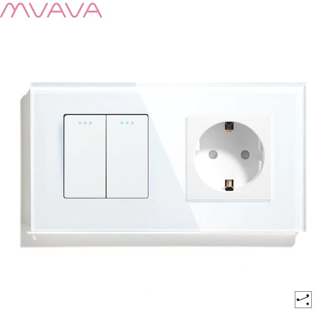 Выключатель с розеткой, 2 клавиши 1 розетка, 2 поста (М2+1F) рамка стекло 157х86мм цвет белый