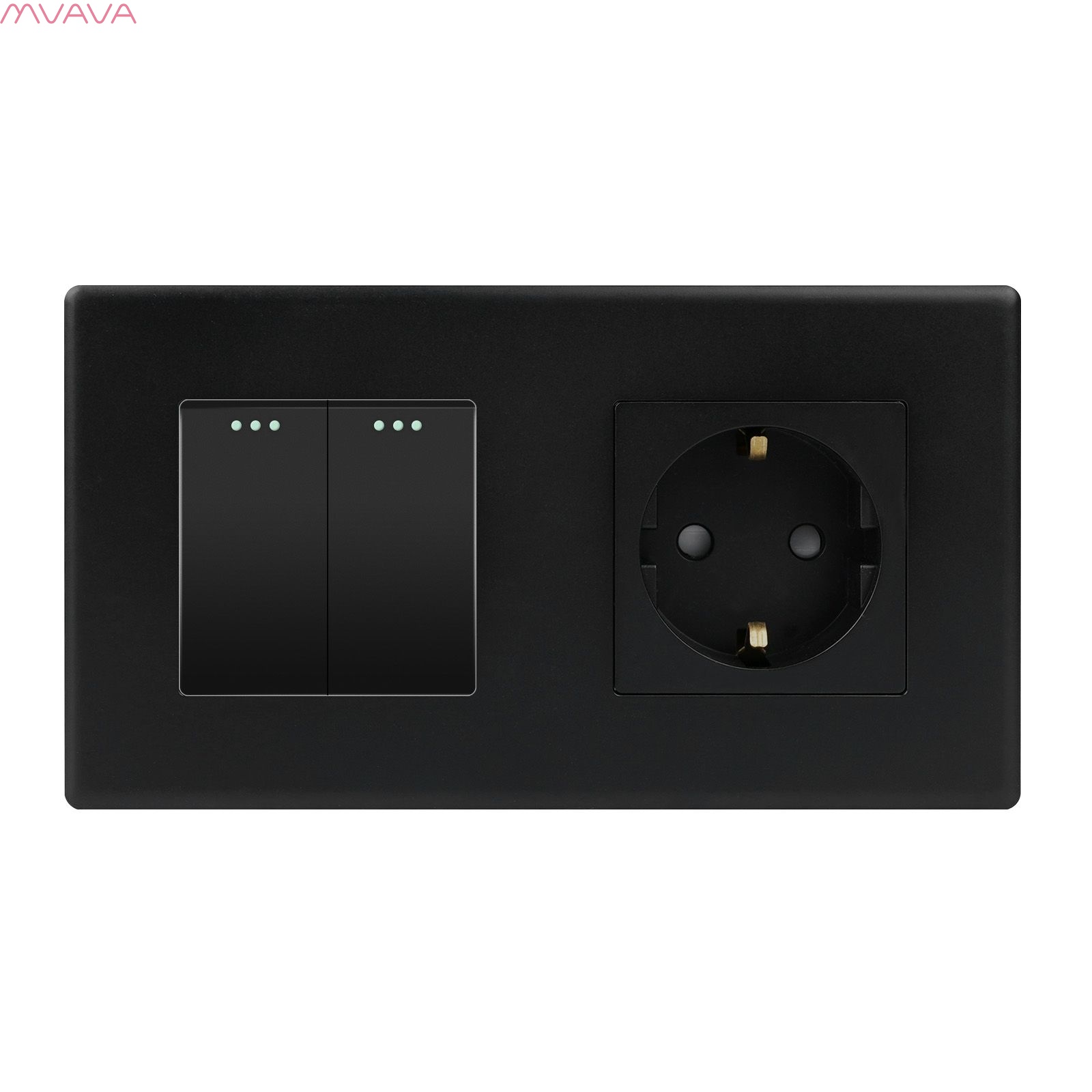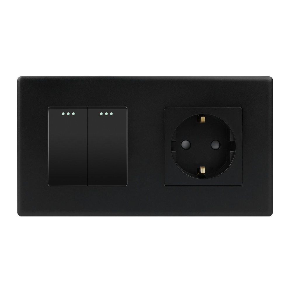 Выключатель с розеткой, 2 клавиши 1 розетка, 2 поста (M+1F) рамка пластик 157х86мм цвет черный