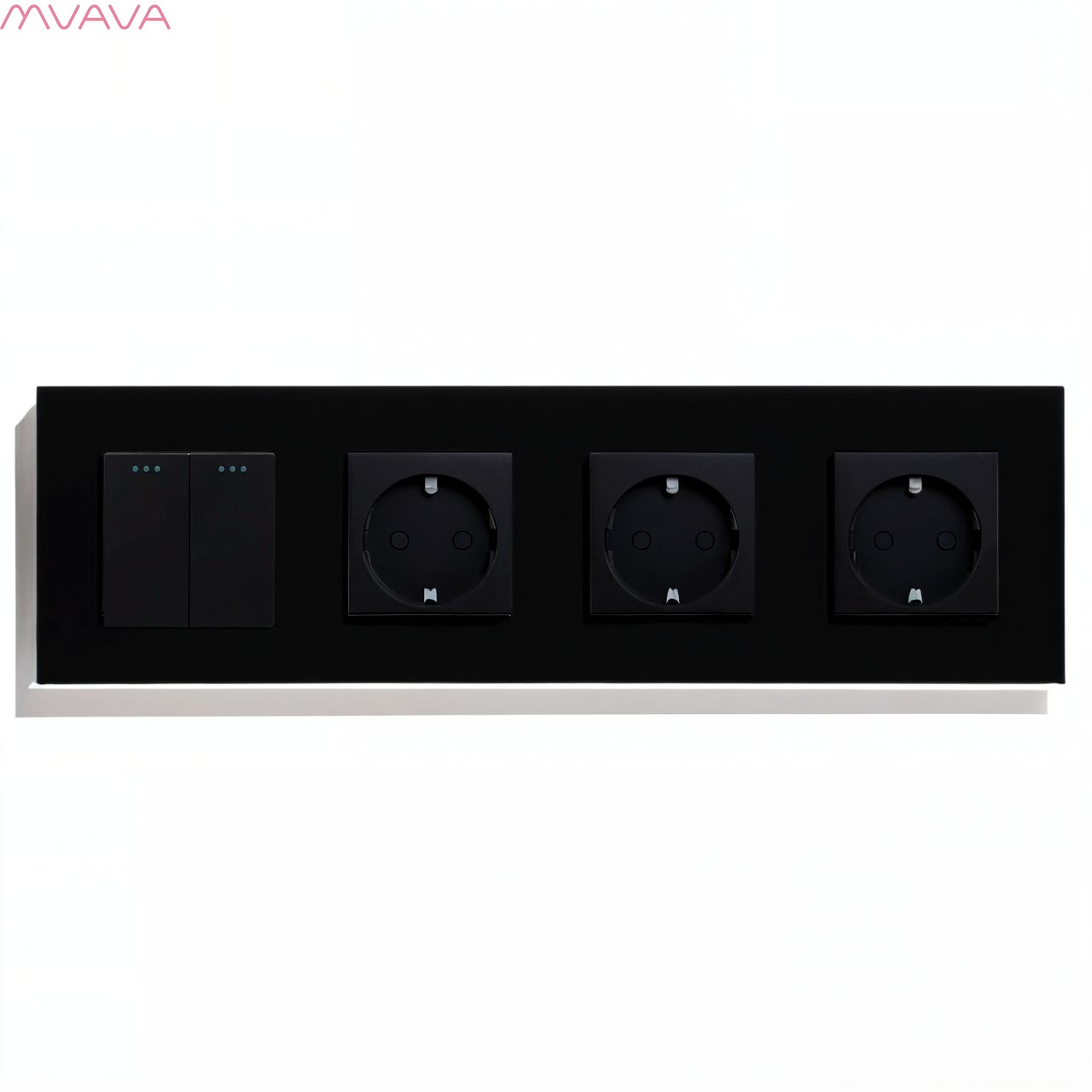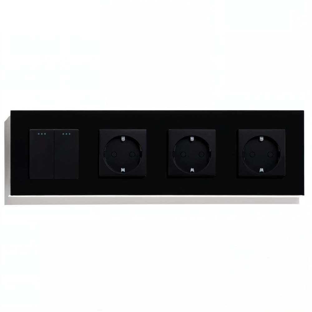 Выключатель с розеткой, 2 клавиши 3 розетки, 4 поста (M2+3F) рамка стекло 299х86мм цвет черный