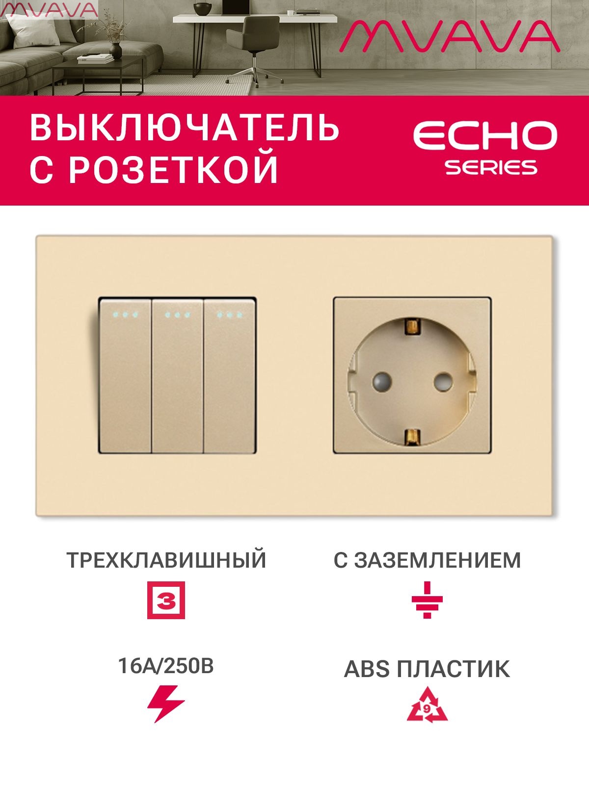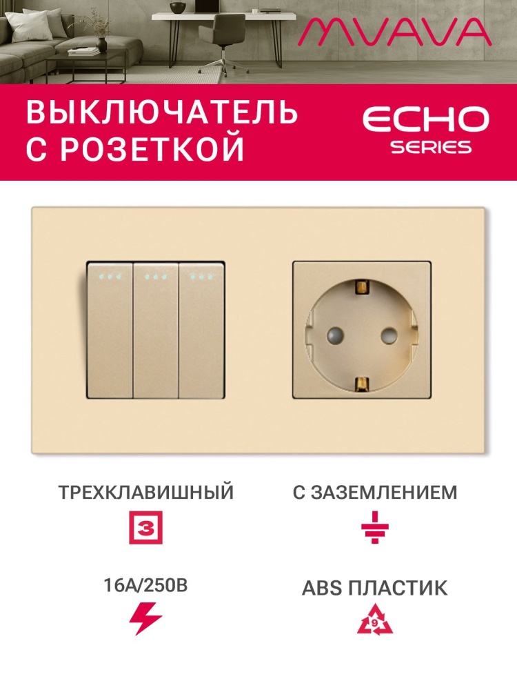 - Трех клавишный выключатель с розеткой , предназначен для включения и выключения светильников, люстр и подключения нагрузки к розетке.