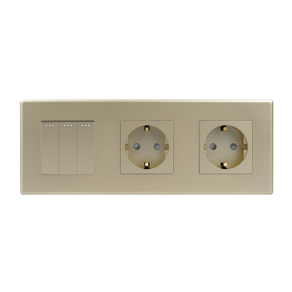 Выключатель с розеткой, 3 клавиши 2 розетки, 3 поста (M3+2F) рамка пластик 228х86мм цвет золотой