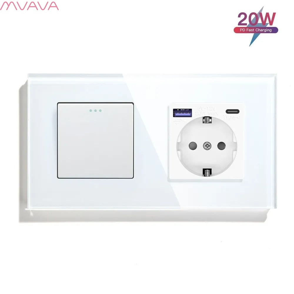 Выключатель с розеткой USB и type-C, 1 клавиша 1 розетка быстрая зарядка 20w, 2 поста (М1+1F) рамка стекло 157х86мм цвет белый