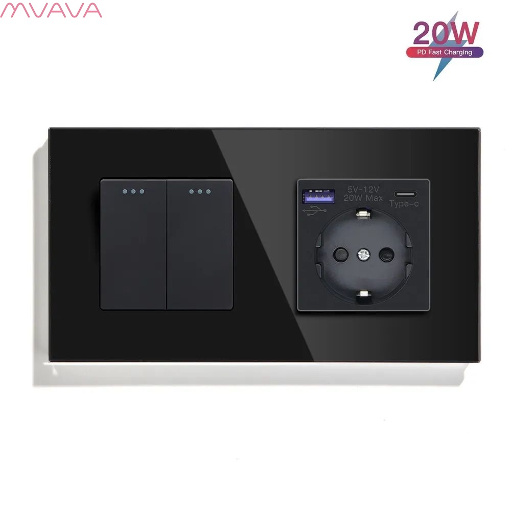 Выключатель с розеткой USB и type-C, 2 клавиши 1 розетка быстрая зарядка 20w, 2 поста (М2+1F) рамка стекло 157х86мм цвет черный