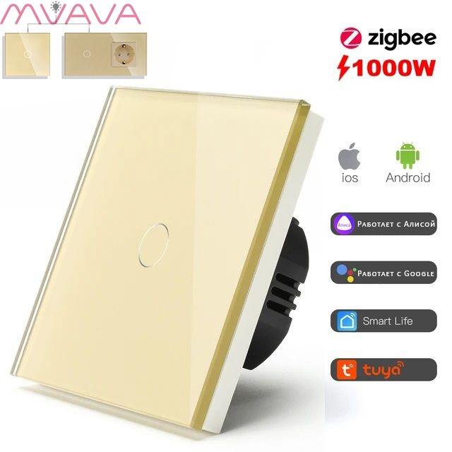 Сенсорный выключатель Zigbee проходной, 1 клавиша 1 пост, (1G) стекло 86х86мм цвет золотой