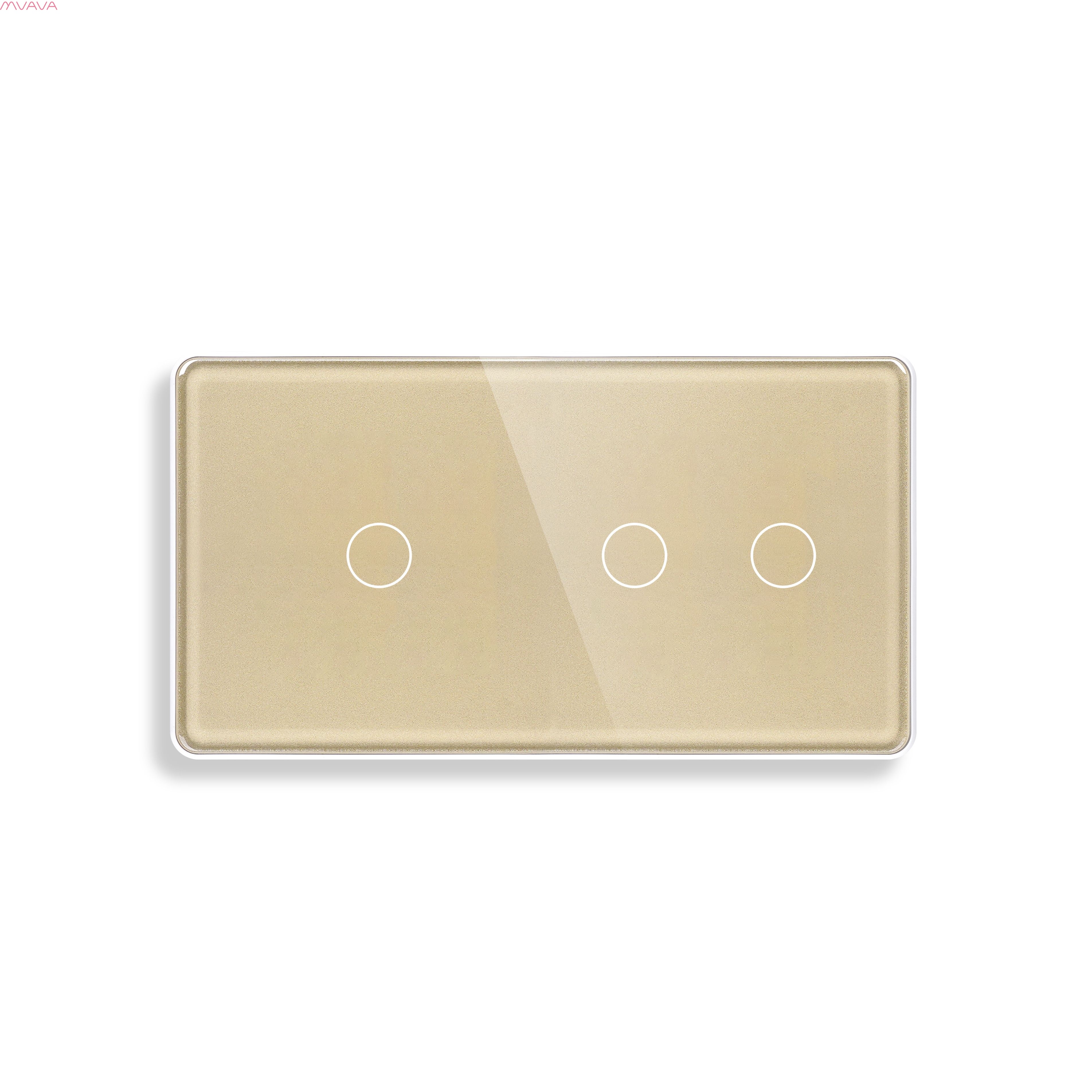 Сенсорный выключатель 3 клавиши, 2 поста (1G+2G) стекло 2.5D 157х86мм цвет золотой