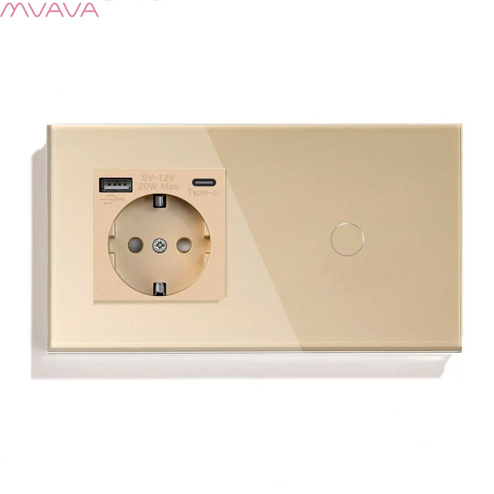 Сенсорный выключатель с розеткой 1 розетка 1кл. 2 поста (1AС+1G) стекло 157х86мм цвет золотой