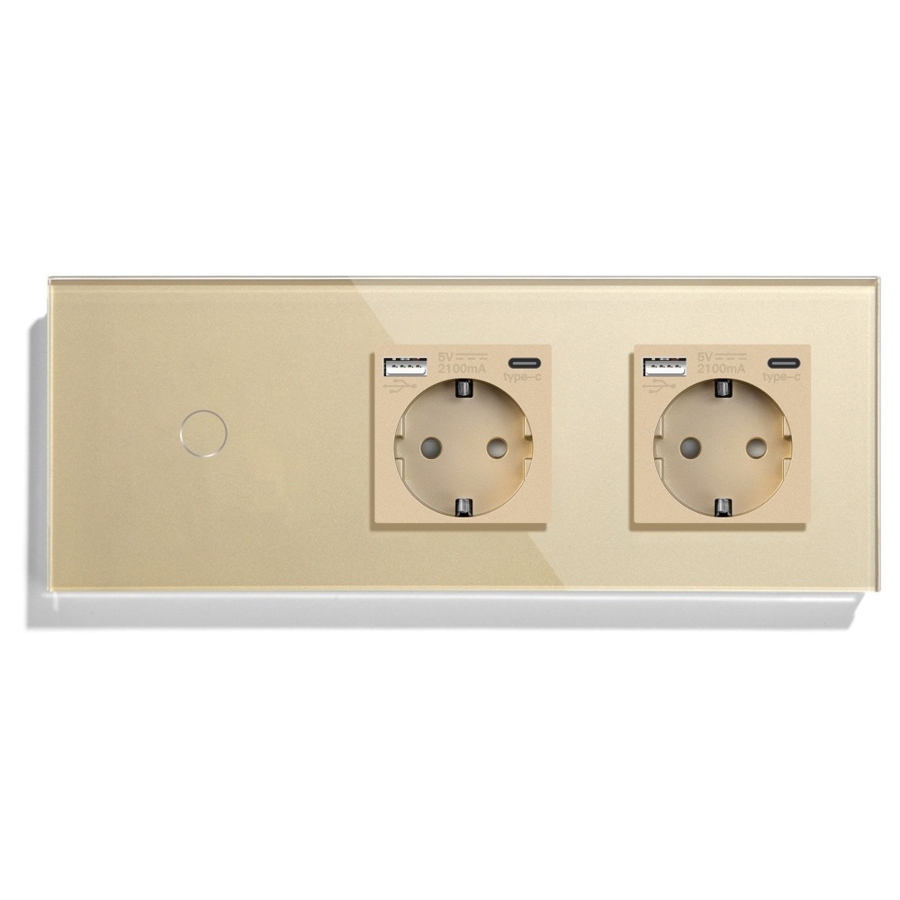 Сенсорный выключатель с розеткой 1кл. 2 розетки, 3 поста (1G+2AC) стекло 228х86мм цвет золотой