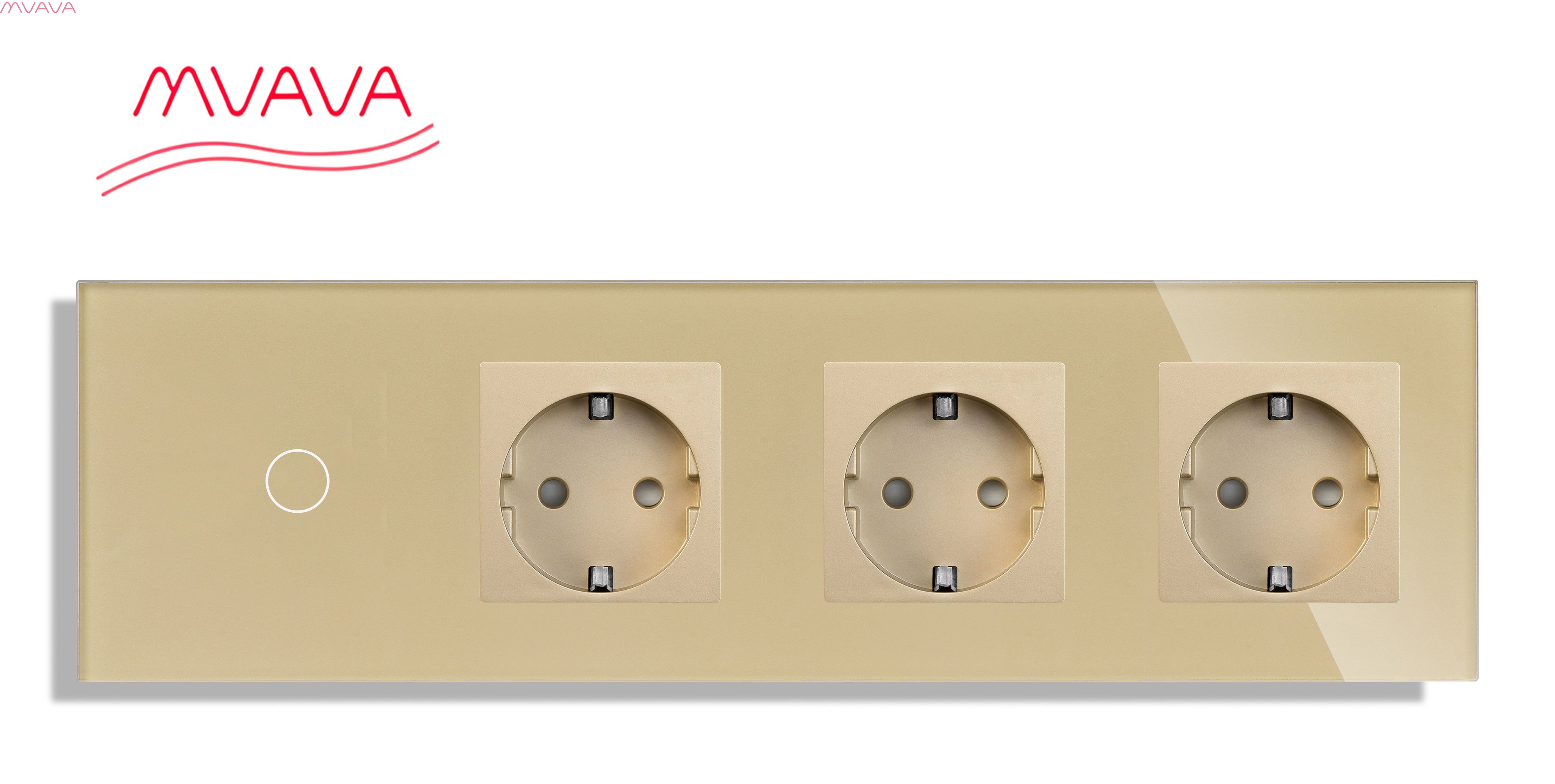 Сенсорный выключатель с розеткой 1кл. 3 розетки, 4 поста (1G+3EU) стекло299х86мм цвет золотой