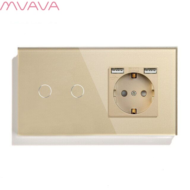 Сенсорный выключатель с розеткой 2кл. 1 розетка, 2 поста (2G+1AA) стекло 157х86мм цвет золотой