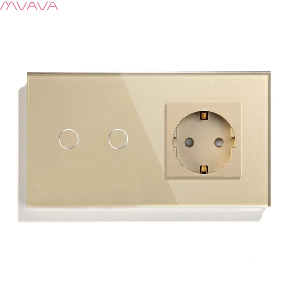 Сенсорный выключатель с розеткой 2кл. 1 розетка, 2 поста (2G+1EU) стекло 157х86мм цвет золотой