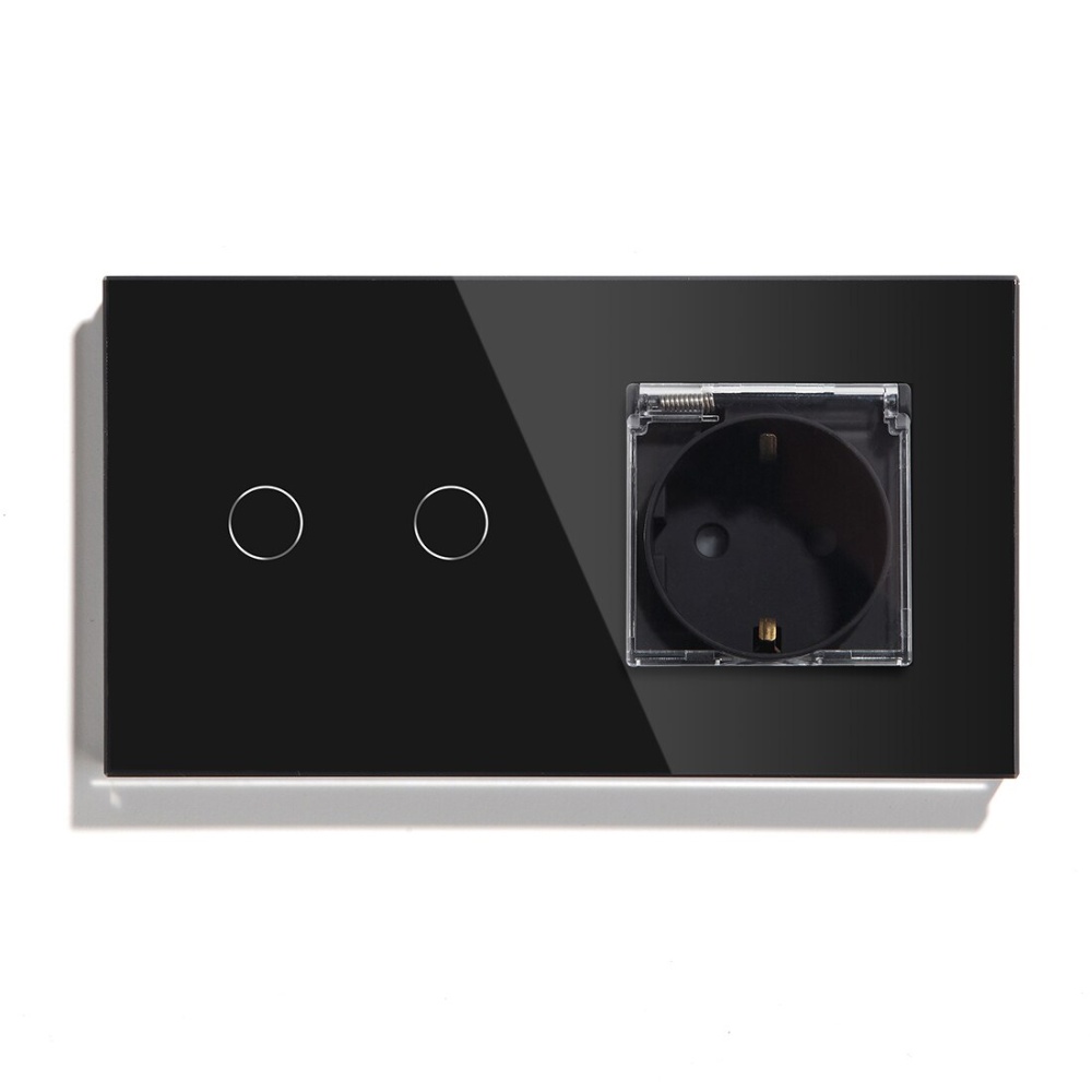 Сенсорный выключатель с розеткой 2кл. 1 розетка IP44, 2 поста (2G+EU) стекло 157х86мм цвет черный