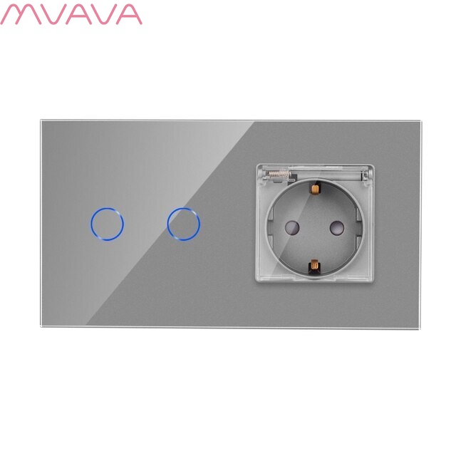 - Сенсорный выключатель с брызгозащитной розеткой евростандарта предназначен для управления двумя линиями освещения и подключение нагрузки до 3500 ватт к розетке . Представляет собой Двух клавишный сенсорный выключатель и розетку объединенные под одной стеклянной панелью. Для включения и выключения света вместо нажатия на механическую клавишу производится прикосновение к сенсорной зоне выключателя.
