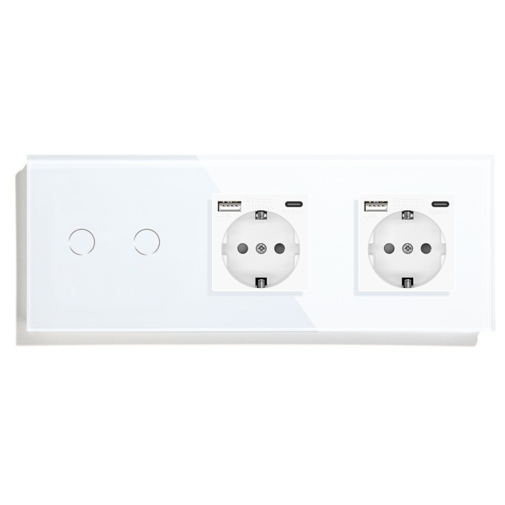 Сенсорный выключатель с розеткой 2кл. 2 розетки, 3 поста (2G+2AC) стекло 228х86мм цвет белый
