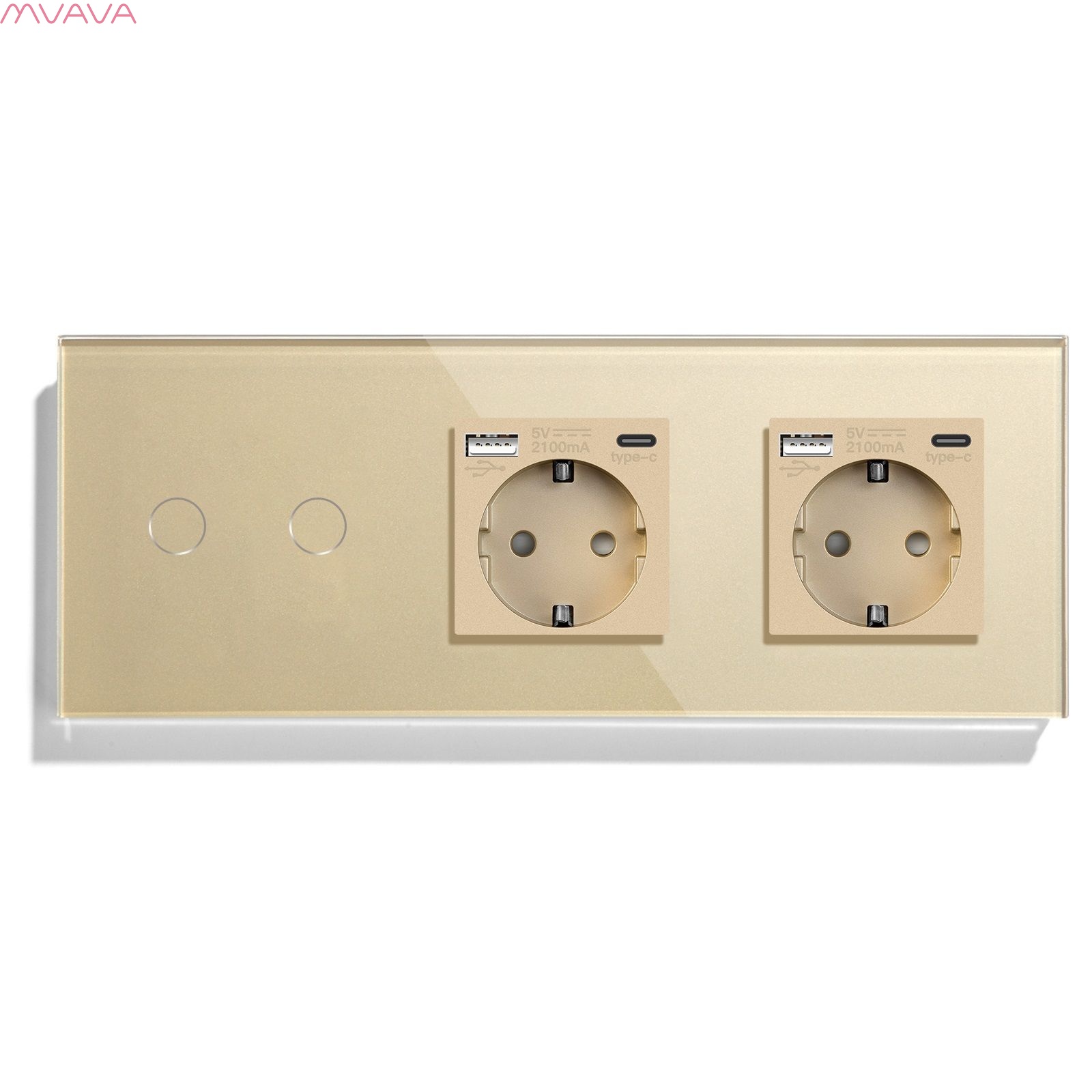 Сенсорный выключатель с розеткой 2кл. 2 розетки, 3 поста (2G+2AC) стекло 228х86мм цвет золотой