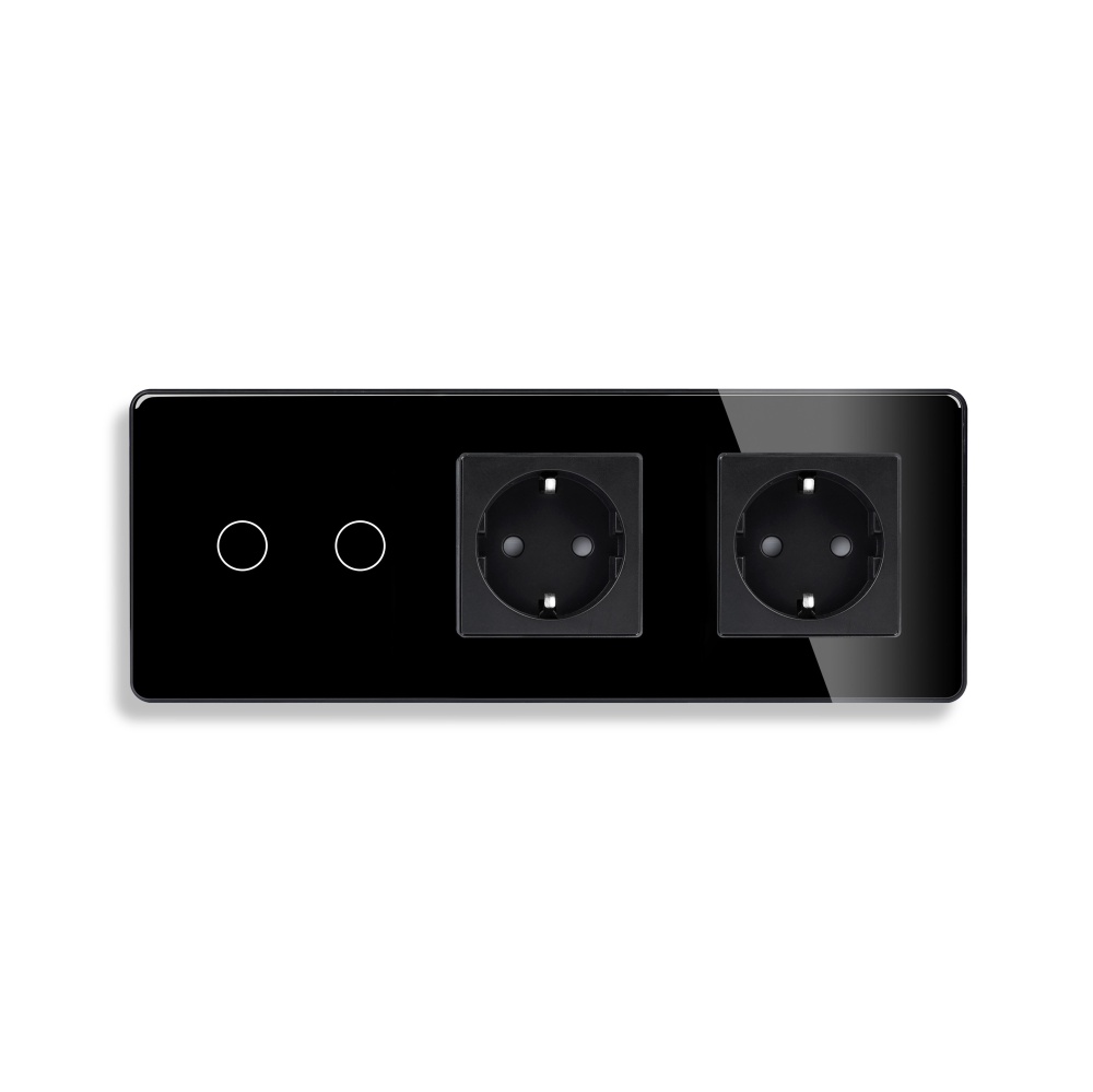 Сенсорный выключатель с розеткой 2кл. 2 розетки, 3 поста (2G+2EU) стекло 2.5D 228х86мм цвет черный