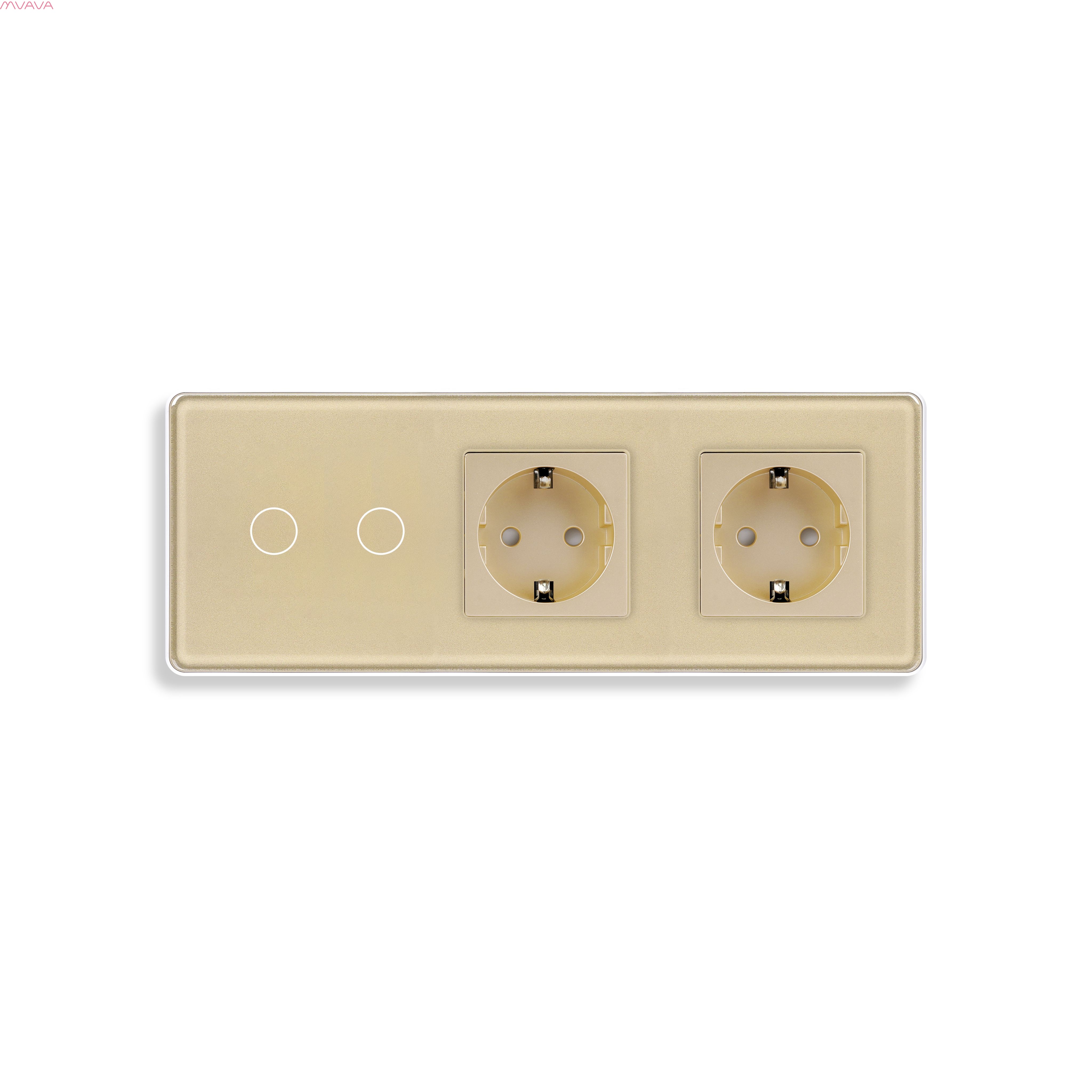 Сенсорный выключатель с розеткой 2кл. 2 розетки, 3 поста (2G+2EU) стекло 2.5D 228х86мм цвет золотой