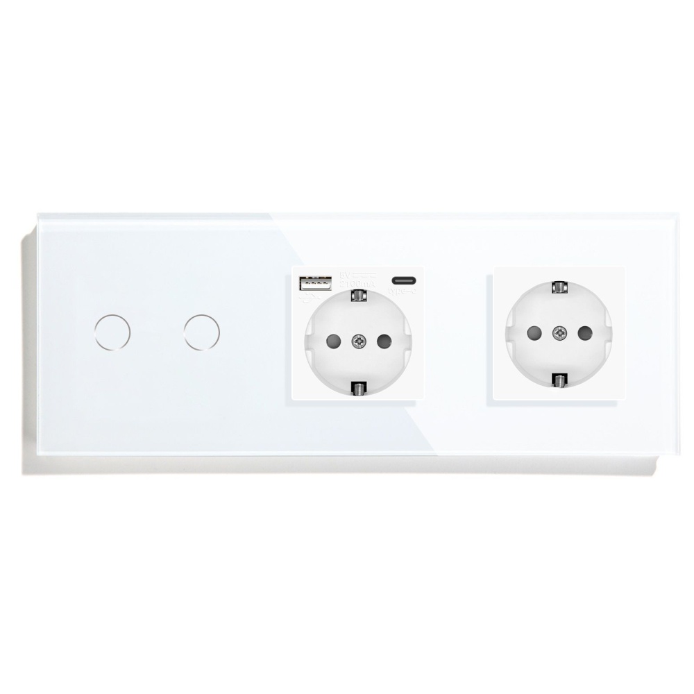 Сенсорный выключатель с розеткой 2кл. 2 розетки, 3 поста (2G+AC/EU) стекло 228х86мм цвет белый