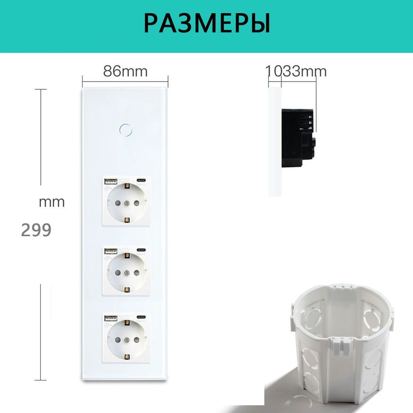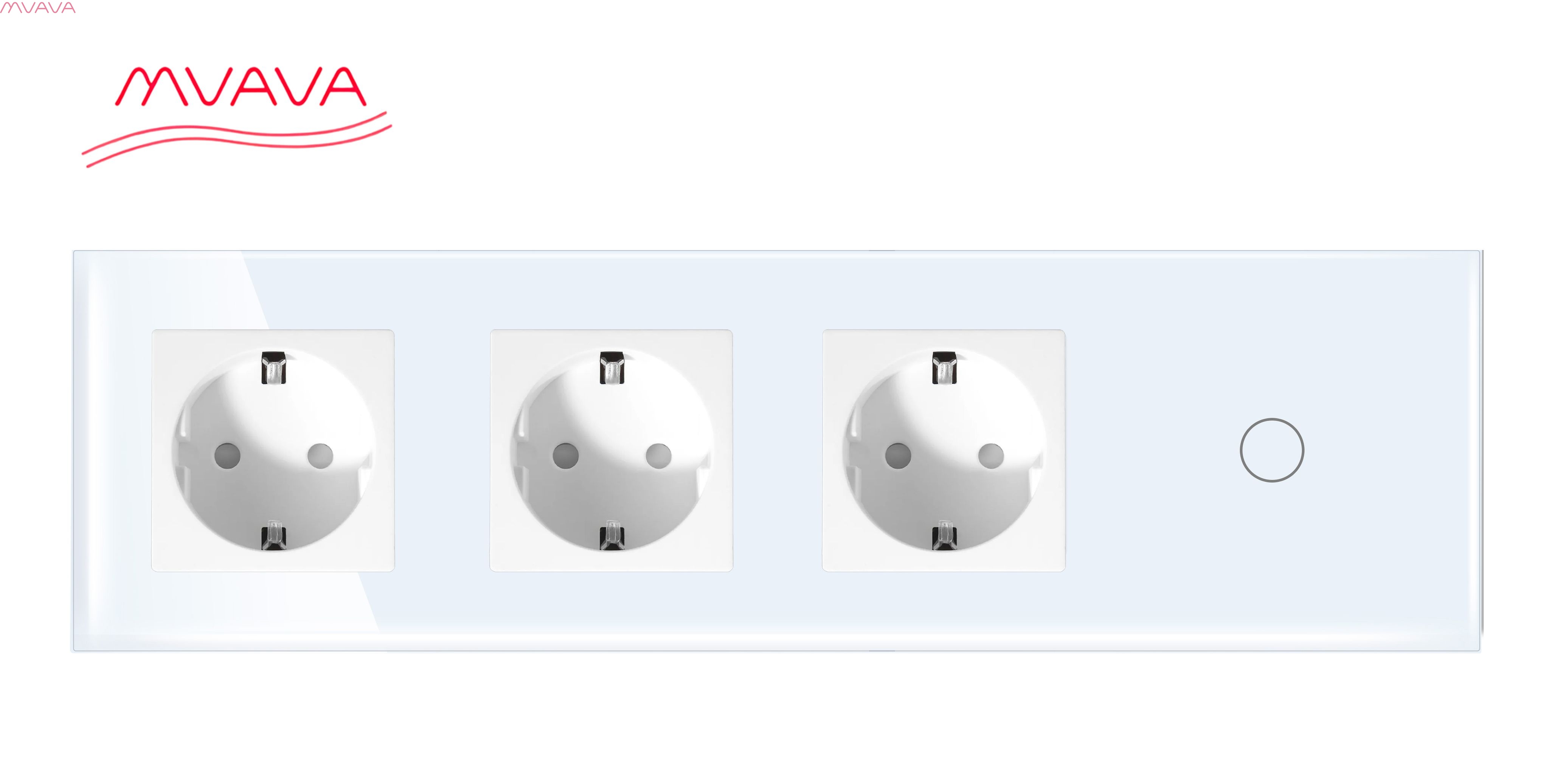 Сенсорный выключатель с розеткой 3 р.1 клавиша, 3 поста (3EU+1G) стекло299х86мм цвет белый
