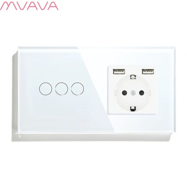 - Сенсорный выключатель с розеткой, двумя USB выходами 5 вольт 2.1А, предназначен для управления тремя линиями освещения, подключения нагрузки к розетке и зарядки электронных устройств. Для включения и выключения света вместо нажатия на механическую клавишу производится прикосновение к сенсорной зоне выключателя.
