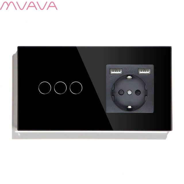 - Сенсорный выключатель с розеткой, двумя USB выходами 5 вольт 2.1А, предназначен для управления тремя линиями освещения, подключения нагрузки к розетке и зарядки электронных устройств. Для включения и выключения света вместо нажатия на механическую клавишу производится прикосновение к сенсорной зоне выключателя.